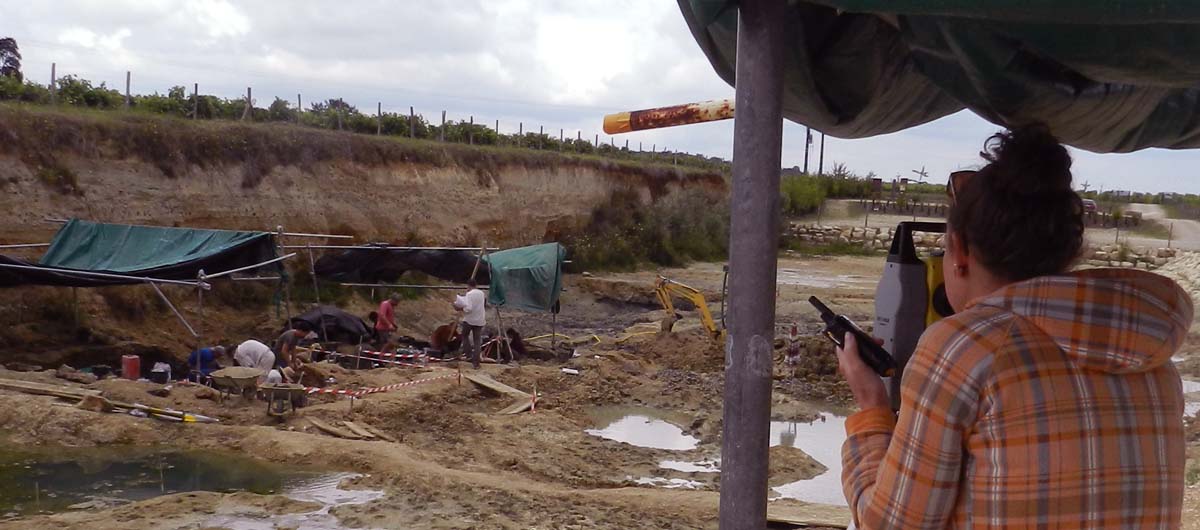 Chaque fossile trouvé en place reçoit son numéro d'inventaire. Il ne bouge pas tant qu'il n'est pas repositionné dans l'espace grâce au théodolite, la station laser fixée plus haut sur le chantier.
