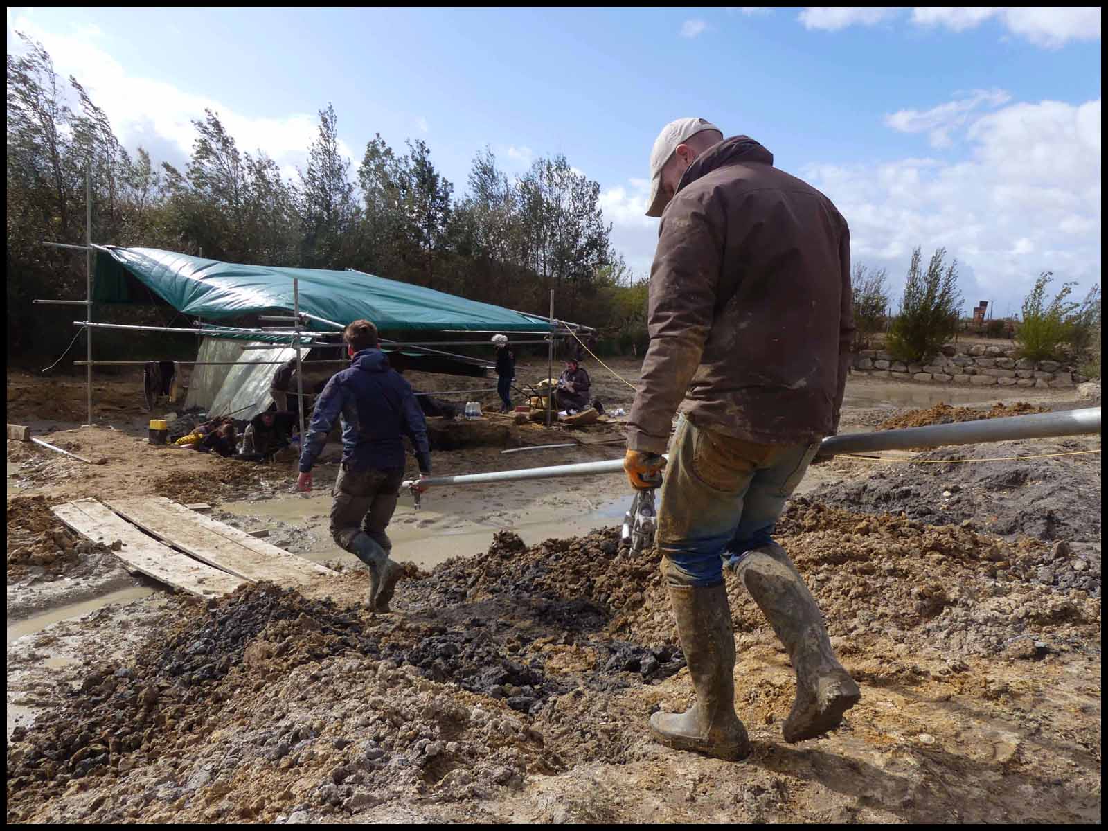 Juste pour dire qu'aujourd'hui, après avoir tout épongé les surfaces de fouilles, écopé le grand trou en "tente B"... il faut retendre les bâches et solidifier les structures.